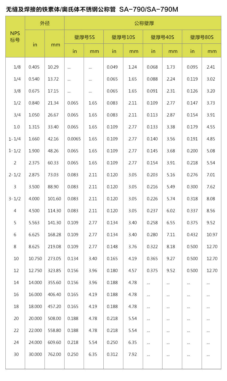 ASTM A789 (ASME SA789)美标双相钢管执行标准 ASTM A789 (ASME SA789)一般用途无缝和焊接铁素体/奥氏体不锈钢管子 性能特点: 1.优良的耐全面腐蚀和耐局部腐蚀性能,特别是耐应力腐蚀、耐点腐蚀、耐缝隙腐蚀、耐腐蚀疲劳及耐磨蚀等 2.良好的焊接性 3.良好的综合力学性能 4.良好的耐晶间腐蚀性能 5.性价比高,服役周期长