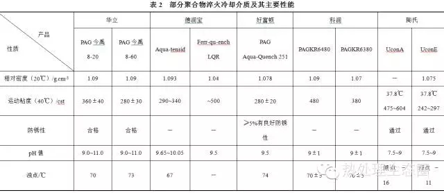 聚合物淬火冷却介质是以聚合物、添加剂和缓冲剂作为溶剂的水溶液。聚合物的冷却性能可以靠改变浓度方式在很宽范围内调节。聚合物的淬火烈度与介质浓度、搅拌程度、液温有关。表1为聚合物淬火冷却介质分类及使用特点。目前市场上销售的部分聚合物淬火冷却介质及其主要性能见表2。