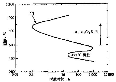 表1列出钢管和钢板的室温力学性能,表2为钢板的高温力学性能。图1为相应韧性为27J的时间–温度–相变曲线。有σ相和475℃两个脆性区。